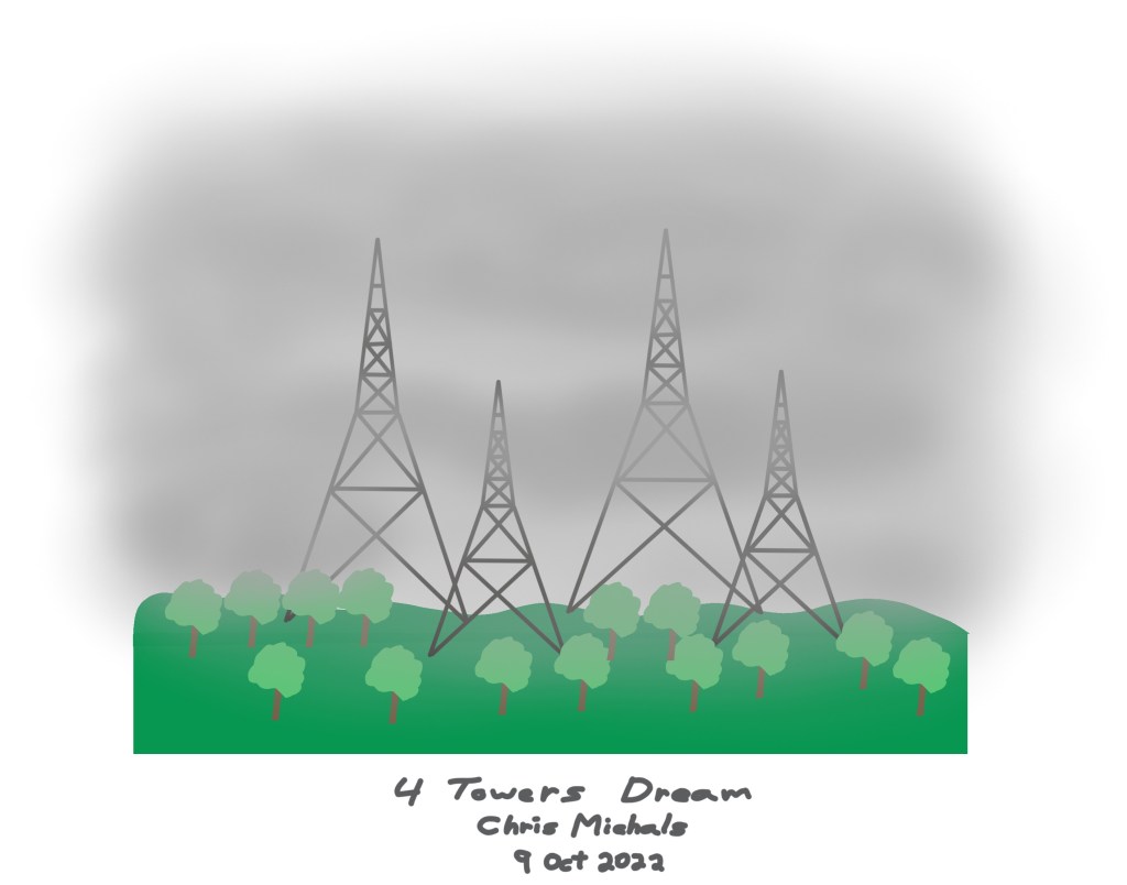 October 9, 2022 – I’m outside in the backyard of my childhood house looking east on a very cloudy and dark daytime setting. I see 2 big radio towers not too far away but then, I see 2 more much bigger ones behind them. The 2 smaller towers had been there for a while but, the 2 larger towers were newly built. The size of the towers, combined with the heavy dark clouds made it look very ominous.