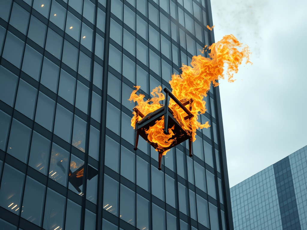 December 14, 2025 – There is a person sitting in a chair inside a dark office. The chair is set on fire and the person in that chair is now outside of, and near the top of, a tall building that looks like a business building with lots of glass windows all over it. The fiery chair with the person in it is falling straight down as if they were in an elevator on the outside of the building.